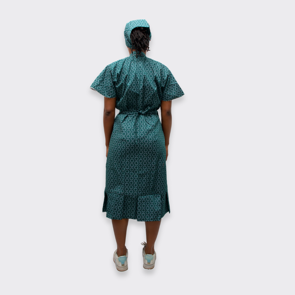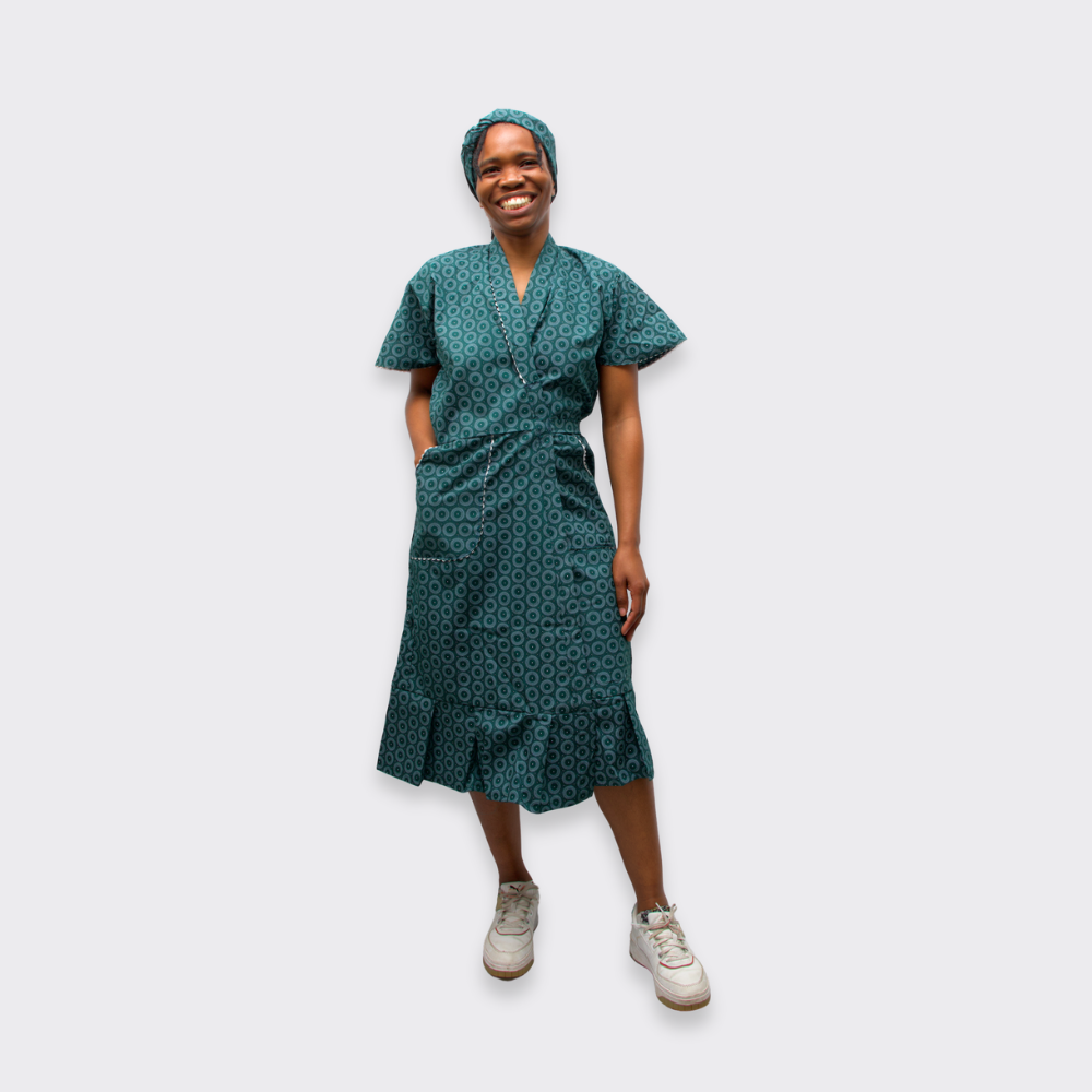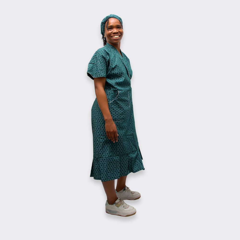 This handmade Shweshwe dress combines practicality with timeless South African heritage. Designed for all-day comfort, it’s perfect for professional wear while adding a touch of colour and culture to the day.